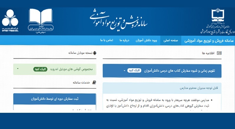 بر این اساس در راستای توسعه دولت الکترونیک و بهمنظور تسهیل دسترسی دانش آموزان به کتابهای درسی، نظارت نظاممند بر فرایند توزیع مواد آموزشی، ثبت سفارش کتابهای درسی سال تحصیلی 1400-1399 دورههای تحصیلی آموزش ابتدایی، متوسطه اول، متوسطه دوم و کتابهای درسی تکمیلی دوره اول متوسطه ویژه دانش آموزان استعدادهای درخشان و همچنین کتابهای درسی دانش آموزان استثنایی از طریق سامانه www.irtextbook.ir یا www.irtextbook.com و برابر جدول تقویم زمانی انجام میشود و کتابهای درسی نیز بر اساس سفارشها ثبتشده در سامانه توزیع میشود.